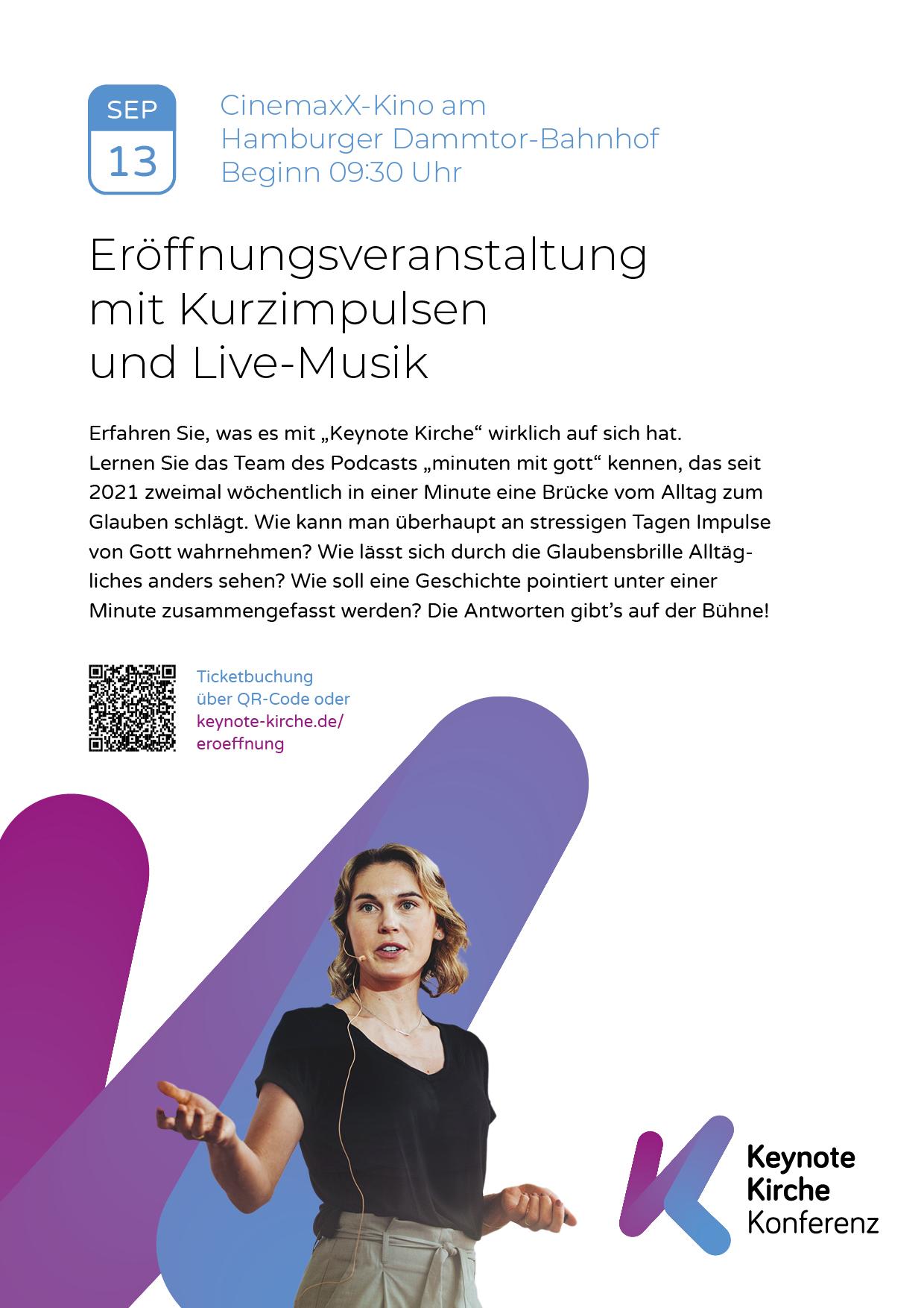 Lassen Sie sich überraschen, wie der Konferenz-Beginn im Hauptsaal 1 gestaltet wird und erfahren Sie, was es mit „Keynote Kirche“ wirklich auf sich hat. Eins vorweg: Lernen Sie das Team des Podcasts „minuten mit gott“ kennen, die seit 2021 zweimal wöchentlich in einer Minute schaffen, was Predigern in 20 Minuten und Speakern in 45 Minuten gelingt: vom Alltag eine Brücke zum Glauben zu schlagen.